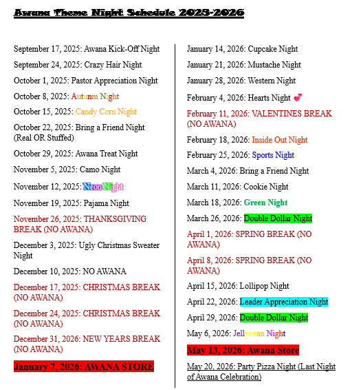 This week at Awana: Green Night! Wear your best green outfit & earn Awana Bucks. 💚