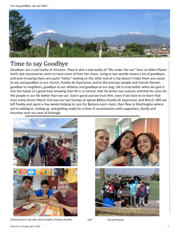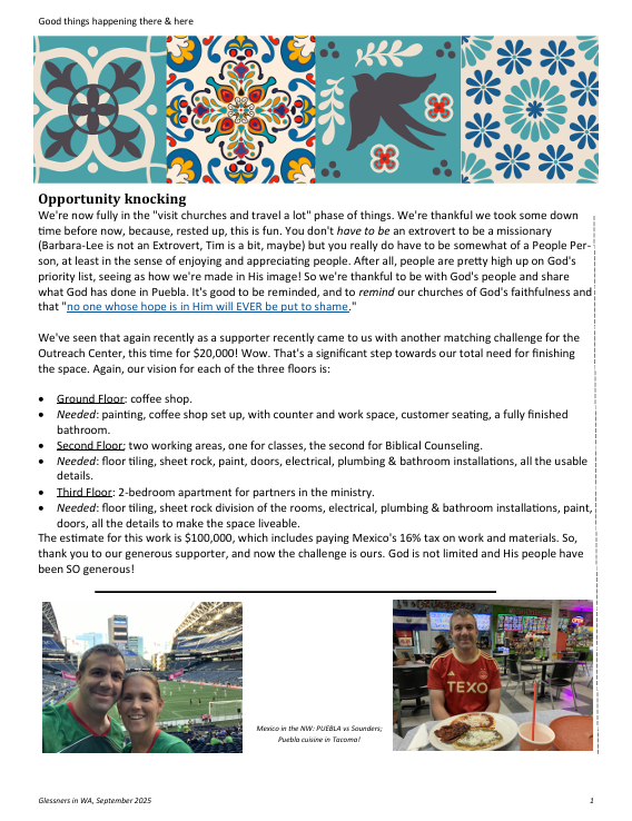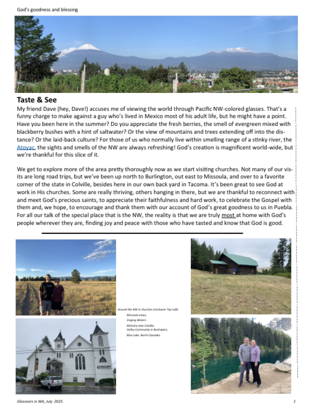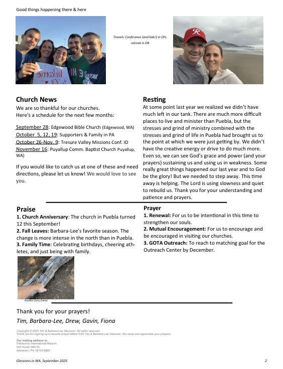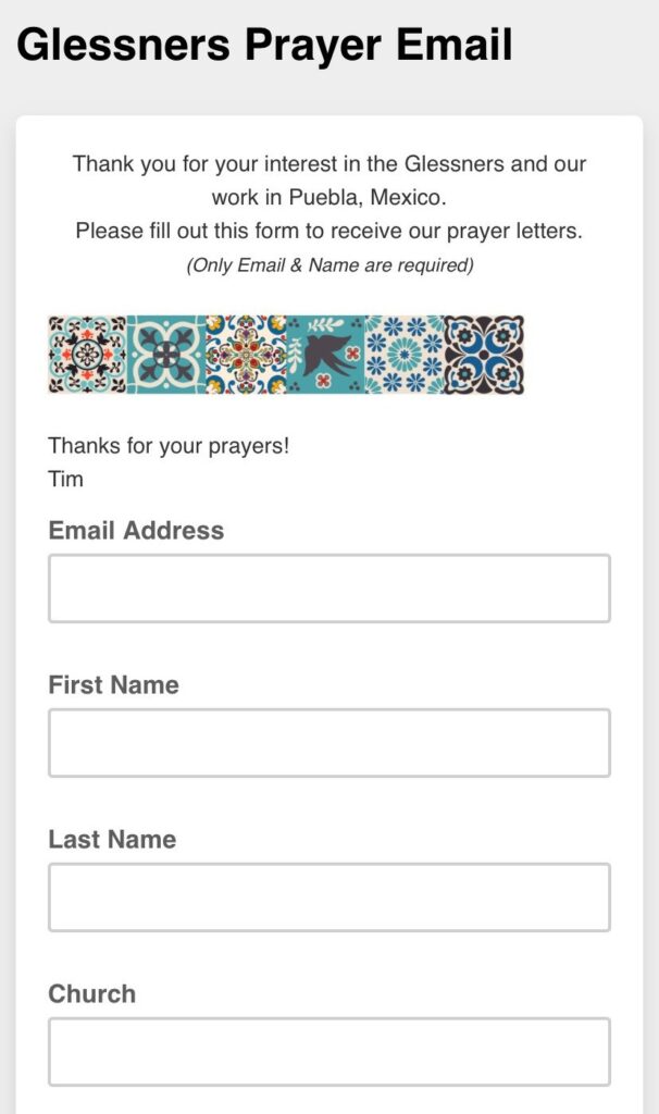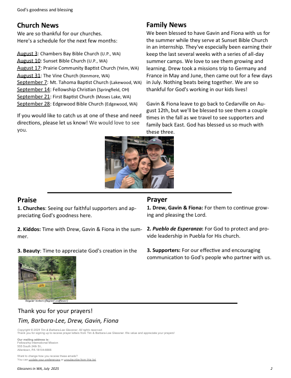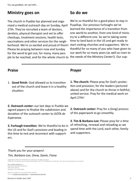 Click here to view the most recent edition of the Glessner’s Prayer Email: