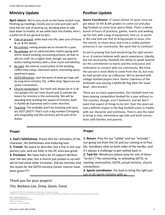 Click here to view the most recent edition of the Glessner’s Prayer Email: